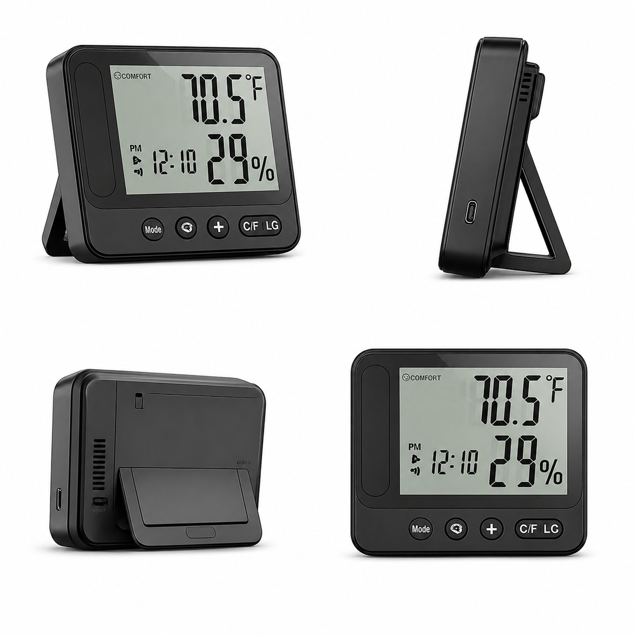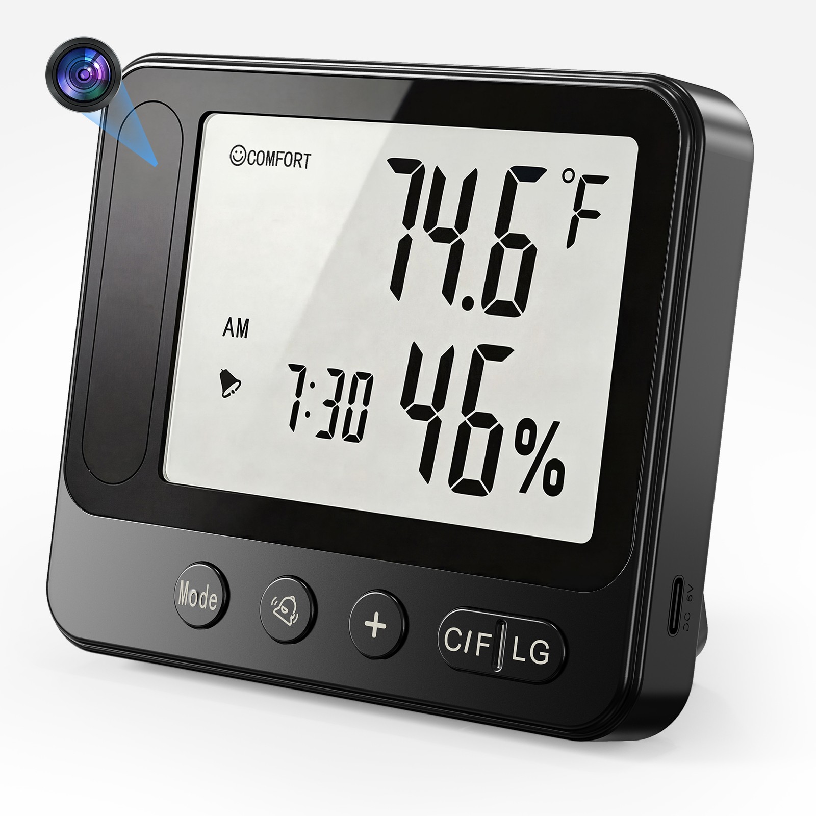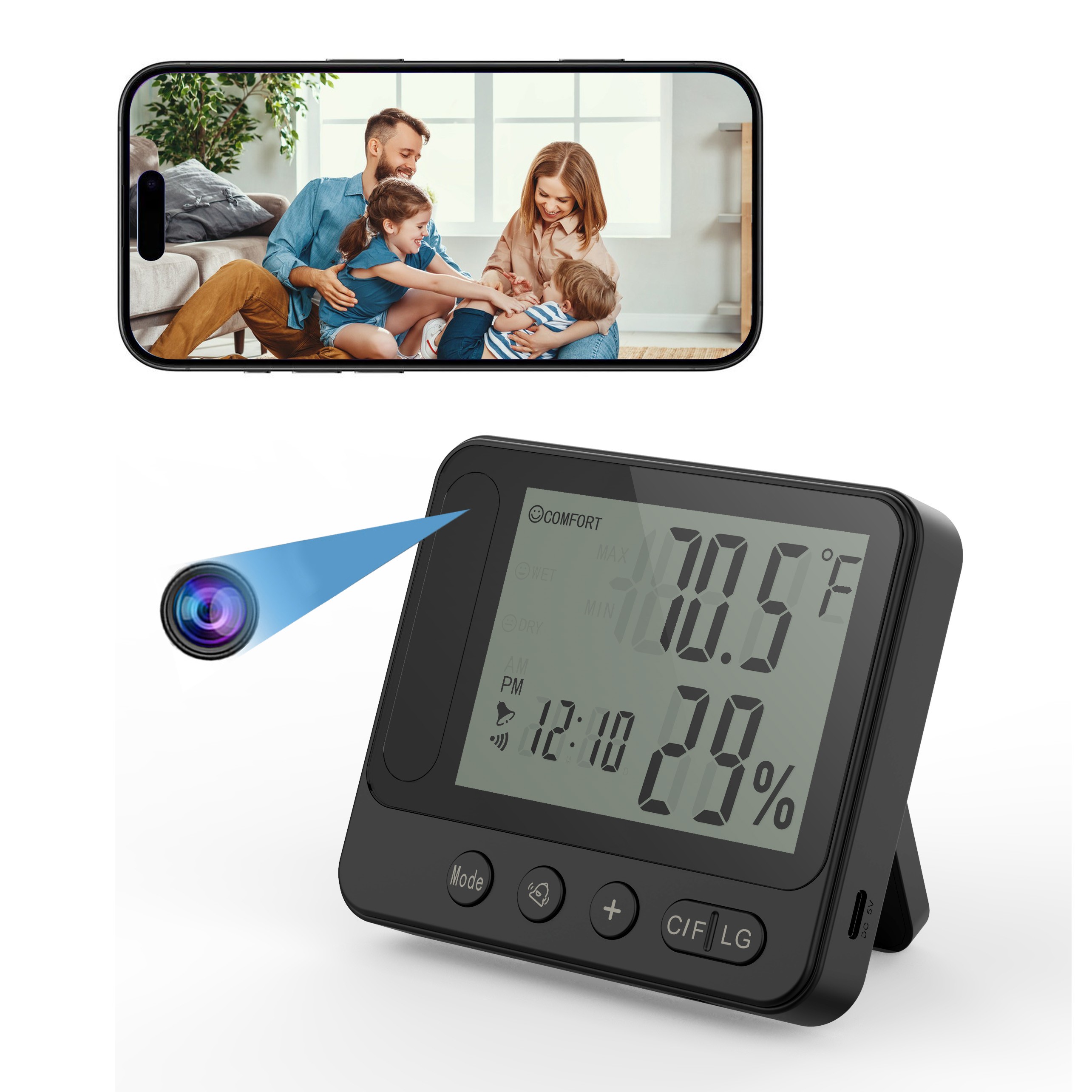 Neben den Funktionen einer Wetterstation zeigt das Gerät nützliche Informationen wie Innentemperatur, Luftfeuchtigkeit, Uhrzeit, Datum und Wecker an. Dadurch bleibt es ein praktisches Alltagsgerät und integriert gleichzeitig eine hochwertige Full-HD-Kamera zur zuverlässigen Überwachung.